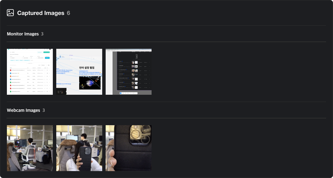이벤트 발생 시점의 스크린, 웹캠 이미지를 확인할 수 있습니다. 기본적으로 이미지는 비공개처리 되며, 이미지를 열람하기 위해서는 보안 감사를 신청해야 합니다.